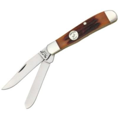Bear & Son Knives - 4th Generation Carbon Steel Mini Trapper Pocket Knife with Red Stag Bone Handles: Model BC-CRSB07. 3 1/2" closed mini trapper. Carbon steel clip and spey blades. Red stag bone handles with polished nickel silver bolsters and inlay sheild. Made in the USA.