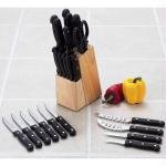 Includes 7-1/2" chef's knife 7-1/8" ham/bread slicer 5-3/4" cleaver 7-1/2" carving knife 6" boning knife 5" utility knife 3" paring knife kitchen scissors six 4-1/2" steak knives and custom wood block. There are also 9 bonus pieces that include 6 additional steak knives 4-3/8" pizza cutter 5" cheese knife and 2-1/2" curved blade paring knife. Limited lifetime warranty. 5.00 Open Stock Value. Gift boxed.