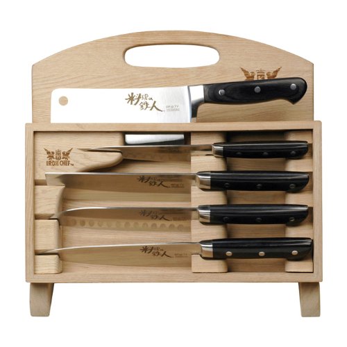440 stainless steel blades provide an effortless slice, dice and chop with a professional touch! Includes cutting board and knife rack! Officially licensed from Iron Chef.