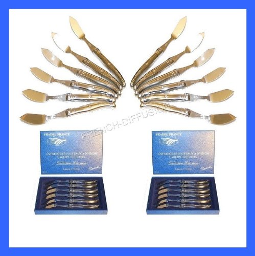 Set of 12 LAGUIOLE fish knives. Delivered in two blue boxes. * * * Gift message + beautiful gift-wrap available! * * * This genuine LAGUIOLE set is suited for any occasion: a dinner party with your friends, the yearly Christmas party or the daily family dinner. With this exceptional LAGUIOLE silverware set each occasion indeed turns really special! * * * Our LAGUIOLE products also make that special, stylish gift: whether to celebrate a birthday, an anniversary, an engagement or wedding, a promotion or Xmas/New Year, this Laguiole set always will be the perfect present. * * * For our full French copper cookware & LAGUIOLE cutlery range: visit our shop (FRENCH-DIFFUSION)