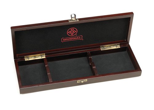 An attractive carving set is a must-have for holidays and other special occasions. Protect your carving set and ensure that it will last you a lifetime by storing it in this attractive case. This solid wood case with a mahogany-like finish safely and conveniently stores a carving knife (up to 8 inches in length) and a carving fork (Mundial's Olivier line only). Brass latches keep the knives securely locked in the case. Measuring 15 1/4 x 5 1/2 x 2 inches, this case is easily storable. The Mundial logo signifies the highest quality and craftsmanship.